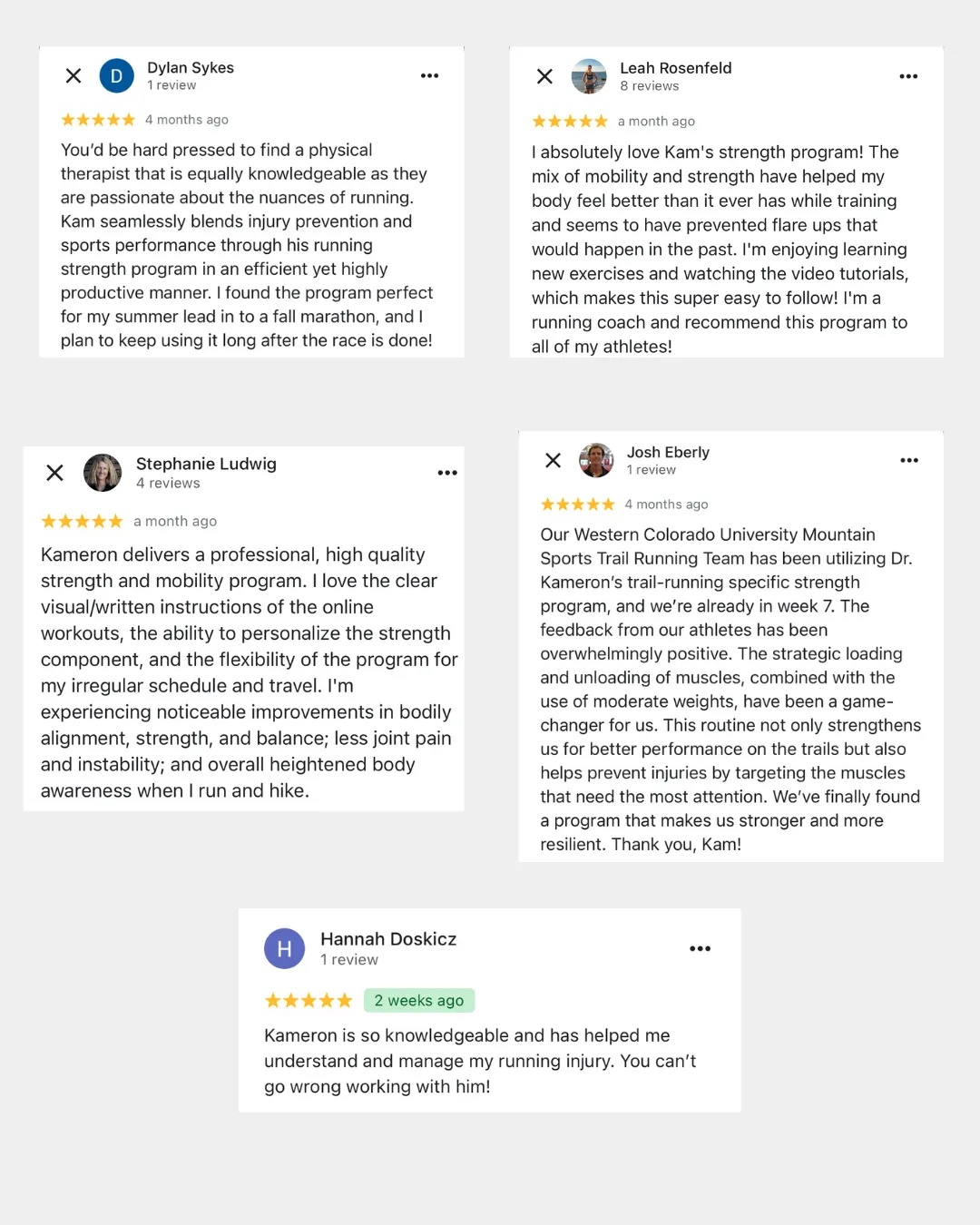 I am a runner, a physical therapist and a strength coach. I have been running for the better part of 20 years and have been working with runners for nearly a decade. I specialized in helping runners recover from injuries, as well stay strong during training to help with performance and injury prevention.
